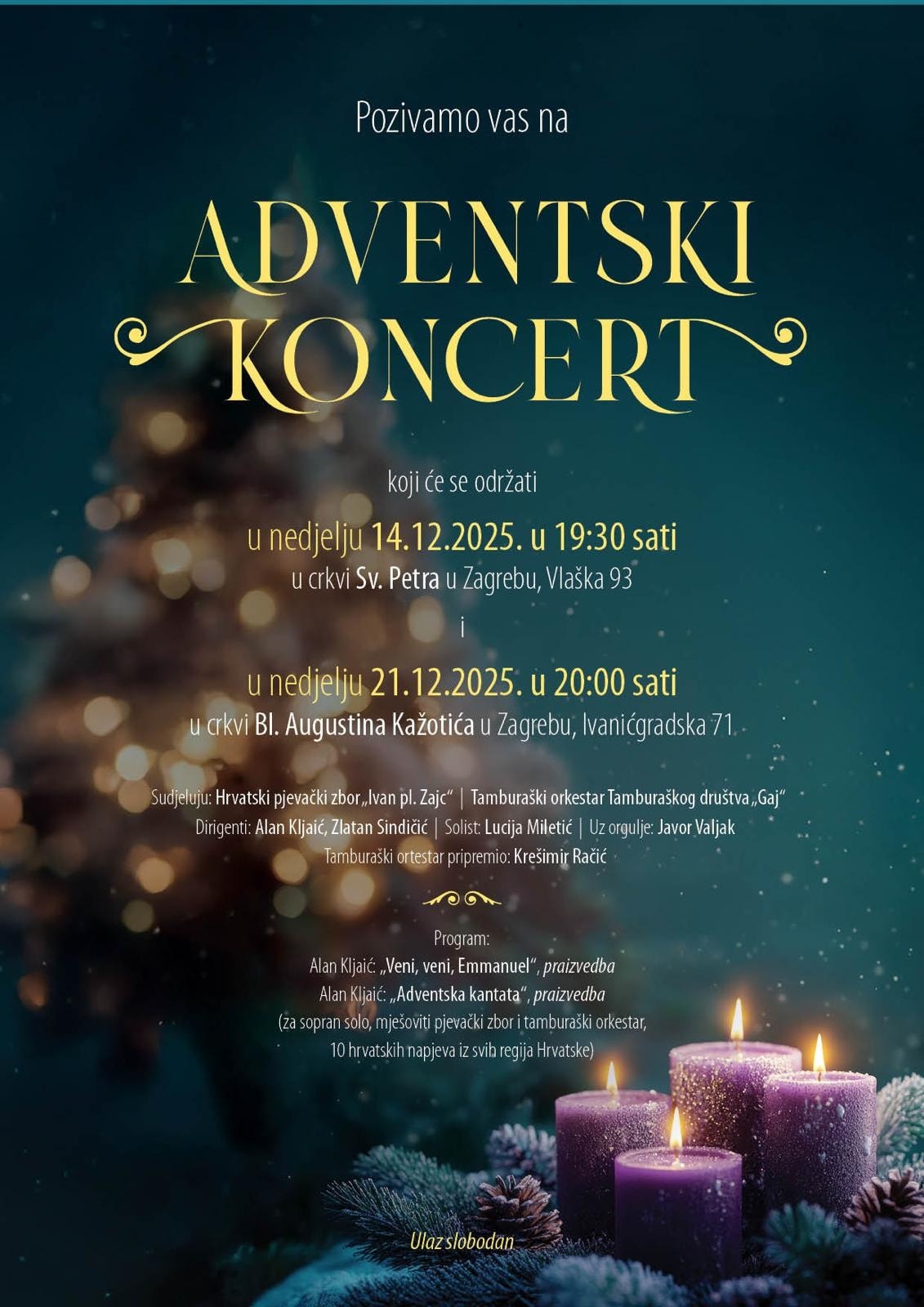 Pozivamo vas na Adventski koncert koji će se održati u Crkvi sv. Petra u Vlaškoj ulici u Zagrebu, dana 14. prosinca s početkom u 19.30. Uz pratnju Tamburaškog orkestra Tamburaškog društva Gaj iz Zagreba nastupit će HPZ Ivan pl. Zajc iz Zagreba sa solistima Lucijom Miletić i Zlatanom Sindičićem. Zajedničkim snagama praizvest će čak dvije adventske skladbe: Veni, veni Emmanuel i Adventsku kantatu.