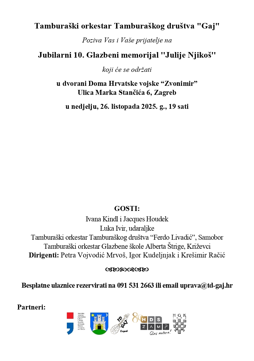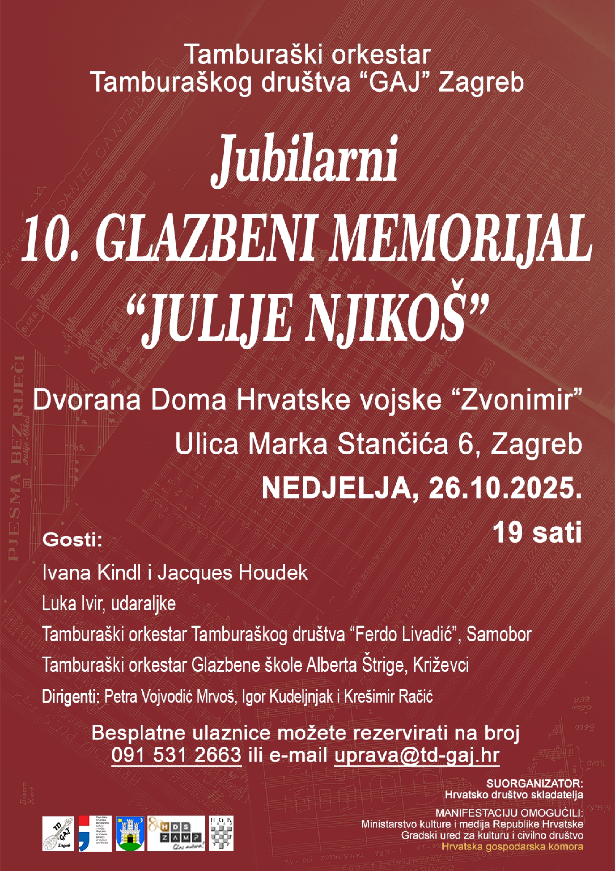 U nedjelju, 26. listopada 2025. godine u 19 sati u u dvorani Doma Hrvatske vojske “Zvonimir” (Ulica Marka Stančića 6, Zagreb) tamburaški orkestar Tamburaškog društva „Gaj“ organizira koncert pod nazivom Jubilarni 10. Glazbeni memorijal "Julije Njikoš". Tamburaškom orkestru „Gaj“ na pozornici će se pridružiti uvaženi vokalni solisti Ivana Kindl i Jacques Houdek, Luka Ivir na udaraljkama te dragi prijatelji iz tamburaškog orkestra Tamburaškog društva „Ferdo Livadić“ iz Samobora i Tamburaškog orkestra Glazbene škole Alberta Štrige, Križevci. Dirigenti ovogodišnjeg memorijala su Petra Vojvodić Mrvoš, Igor Kudeljnjak i Krešimir Račić.