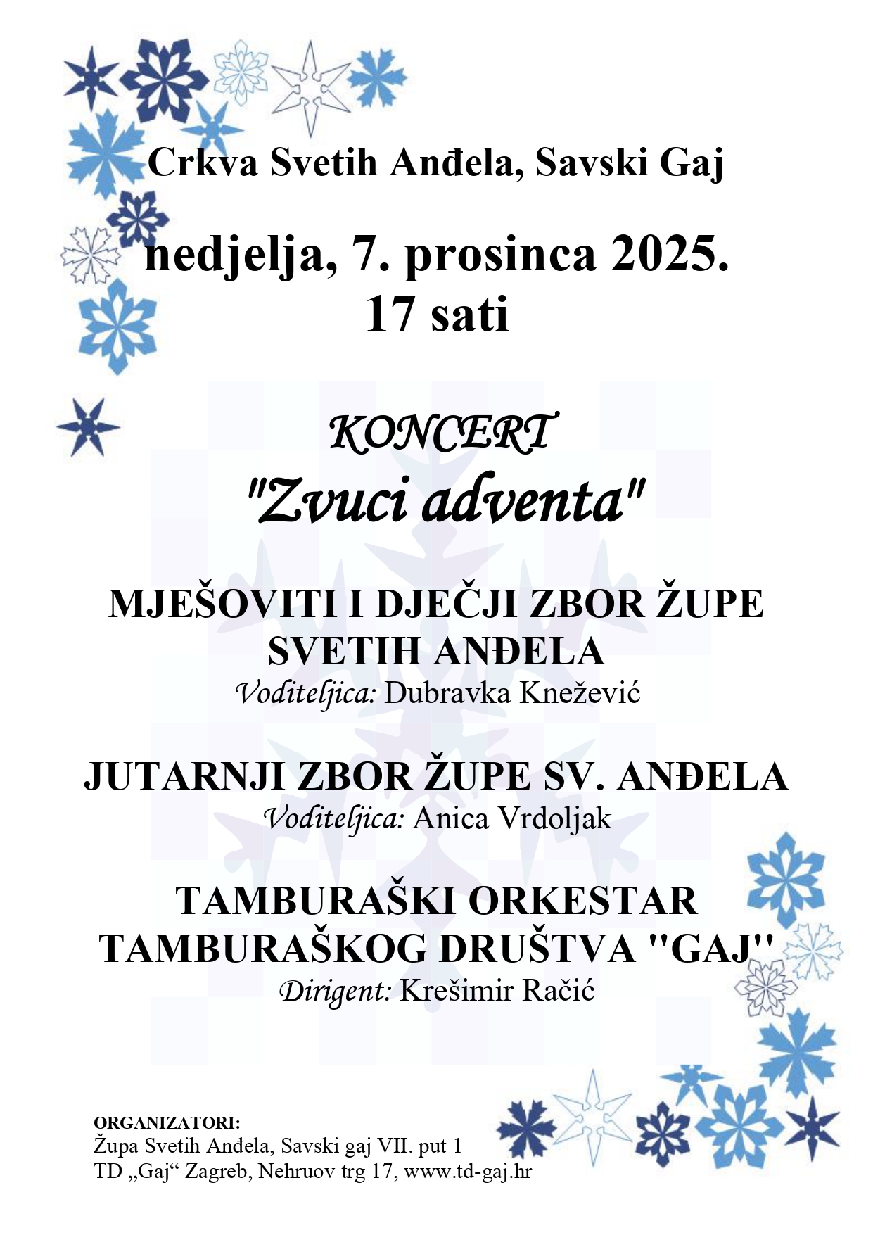 U nedjelju, 7. prosinca 2025. godine s početkom u 17 sati, u našoj Crkvi Sv. Anđela u Savskom Gaju, tamburaški orkestar Tamburaškog društva "Gaj" u suradnji sa Župom Sv. Anđela priređuje svečani koncert pod nazivom "Zvuci adventa".