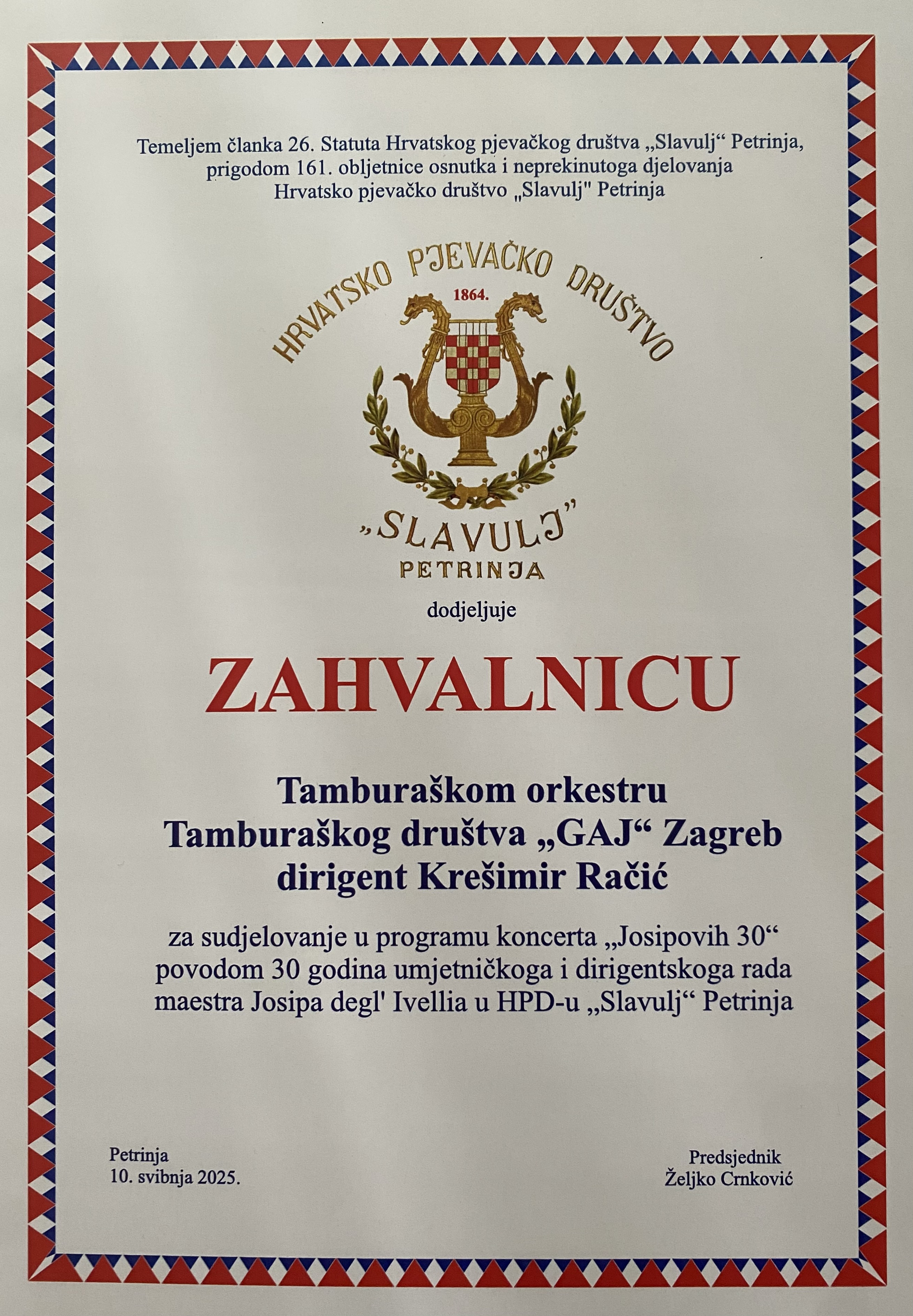 Tamburaški orkestar Tamburaškog društva "Gaj" bio je gost na Godišnjem koncertu Hrvatskog pjevačkog društva "Slavulj" Petrinja, koji se održao 10. svibnja 2025. godine s početkom u 20 sati u velikoj dvorani Pučkog otvorenog učilišta Hrvatski dom Petrinja. Koncert je organiziran u povodu obilježavanja 30 godina umjetničkog rada dirigenta Josipa degl' Ivellija sa HPD "Slavlju".