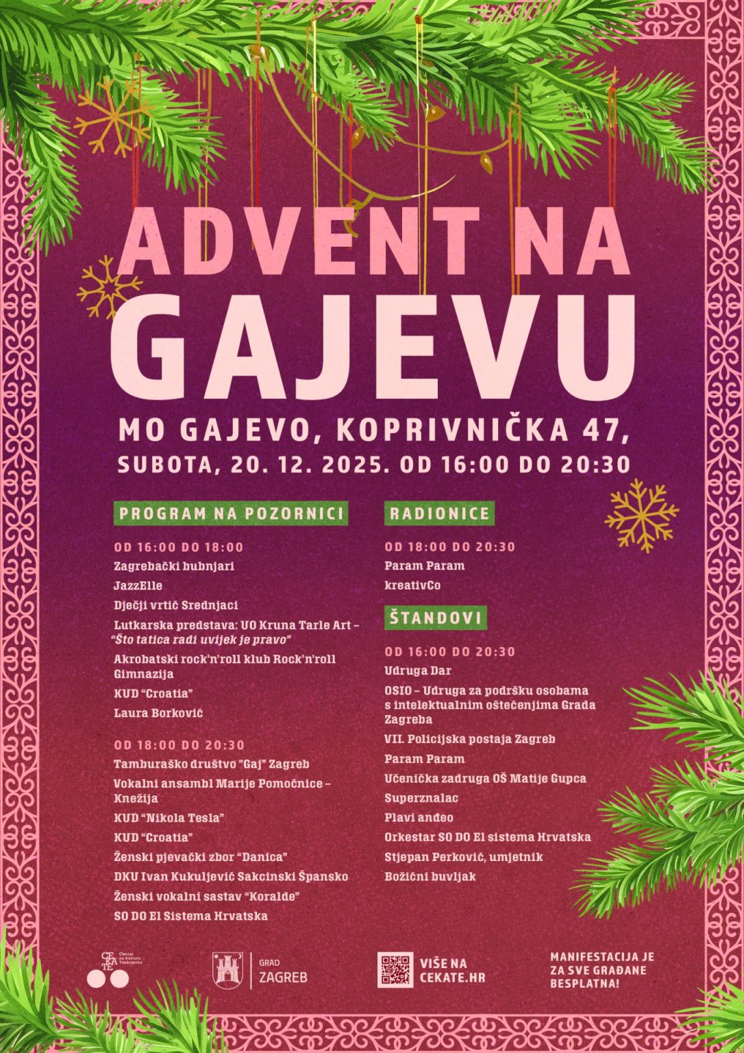 U subotu, 20. prosinca 2025., Tamburaško društvo GAJ Zagreb nastupit će na manifestaciji Advent na Gajevu, u organizaciji Centra za kulturu Trešnjevka, Vijeća Mjesnog odbora Gajevo i Vijeća Gradske četvrti Trešnjevka – jug. Nastup će se održati u prostoru Mjesnog odbora Gajevo, Koprivnička 47, od u 17:45 sati, a ulaz je slobodan.